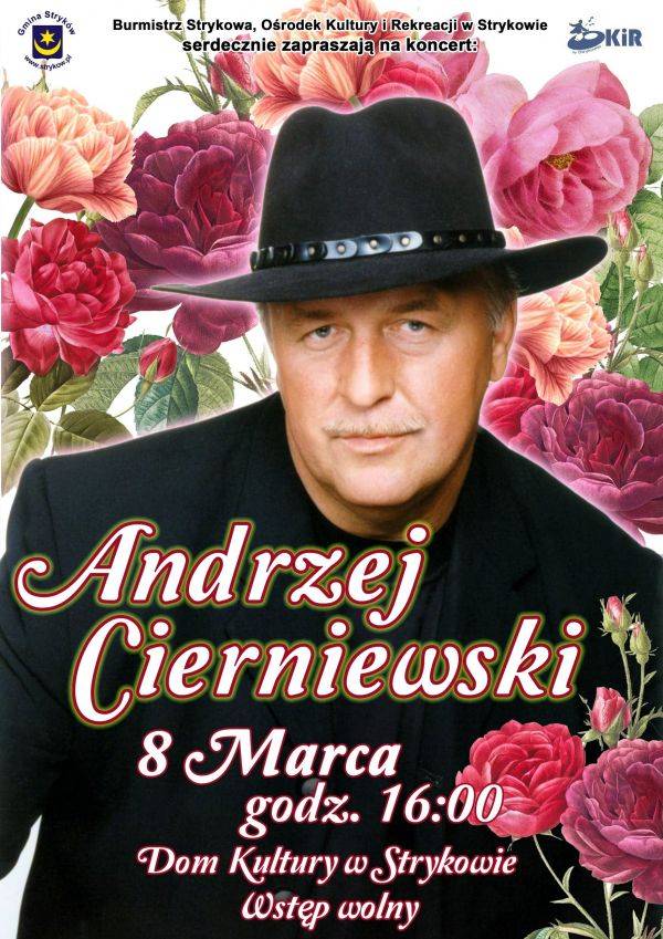 Z okazji Dnia Kobiet Burmistrz Strykowa oraz Ośrodek Kultury i Rekreacji w Strykowie serdecznie zapraszają na koncert Andrzeja Cierniewskiego.