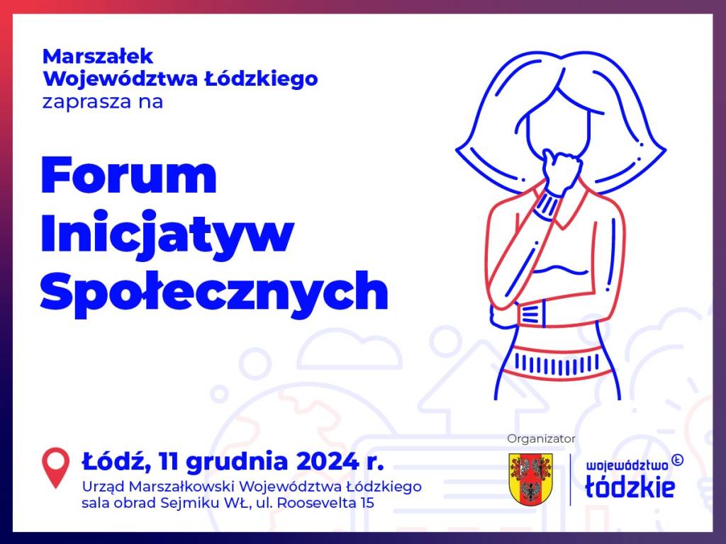 Forum Inicjatyw Społecznych odbędzie się 11 grudnia w Sali obrad Sejmiku Województwa Łódzkiego przy ul. Roosevelta 15 w Łodzi. Start o godzinie 8:45. Udział w wydarzeniu jest bezpłatny, jednak obowiązuje rejestracja.
