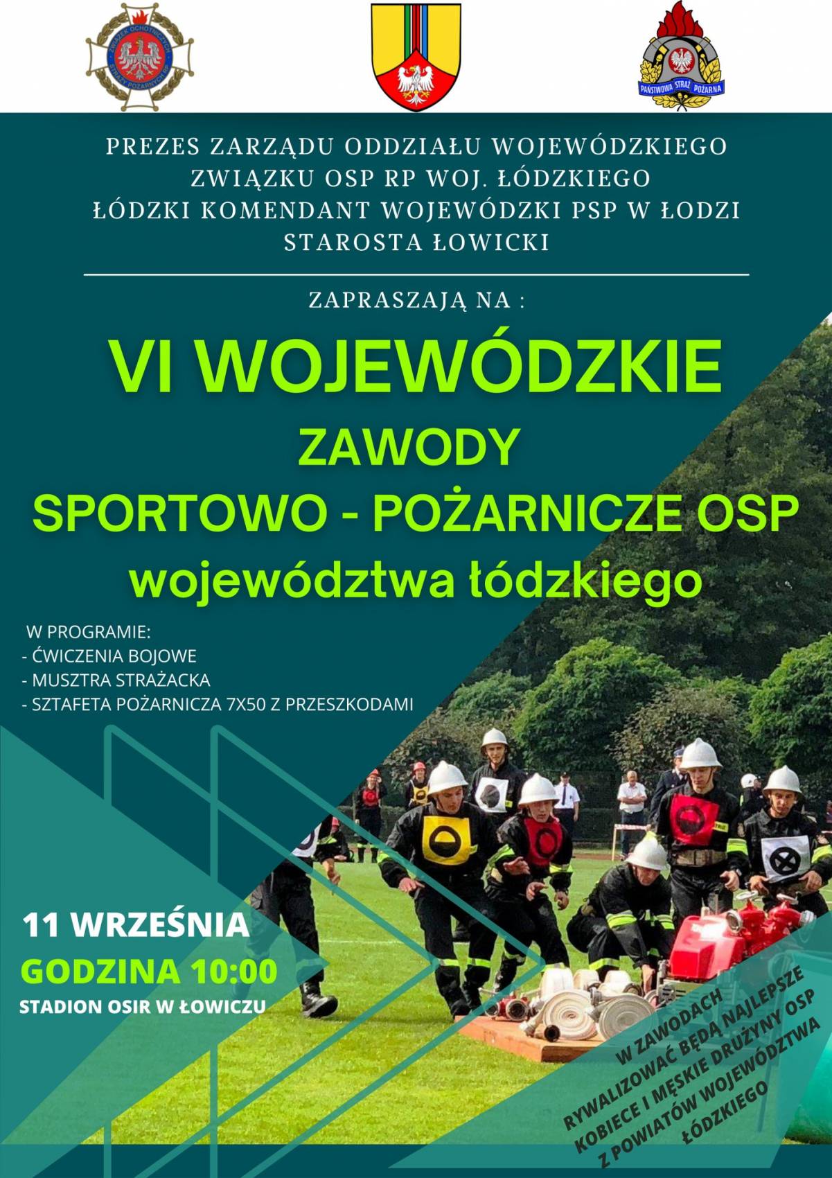 Na VI Wojewódzkie Zawody Sportowo-Pożarnicze OSP województwa łódzkiego zapraszają Prezes Zarządu Oddziału Wojewódzkiego Związku OSP RP województwa łódzkiego, Łódzki Komendant Wojewódzki PSP w Łodzi oraz Starosta łowicki. W programie zawodów ćwiczenia bojowe, musztra strażacka i sztafeta pożarnicza 7x50 metrów z przeszkodami.