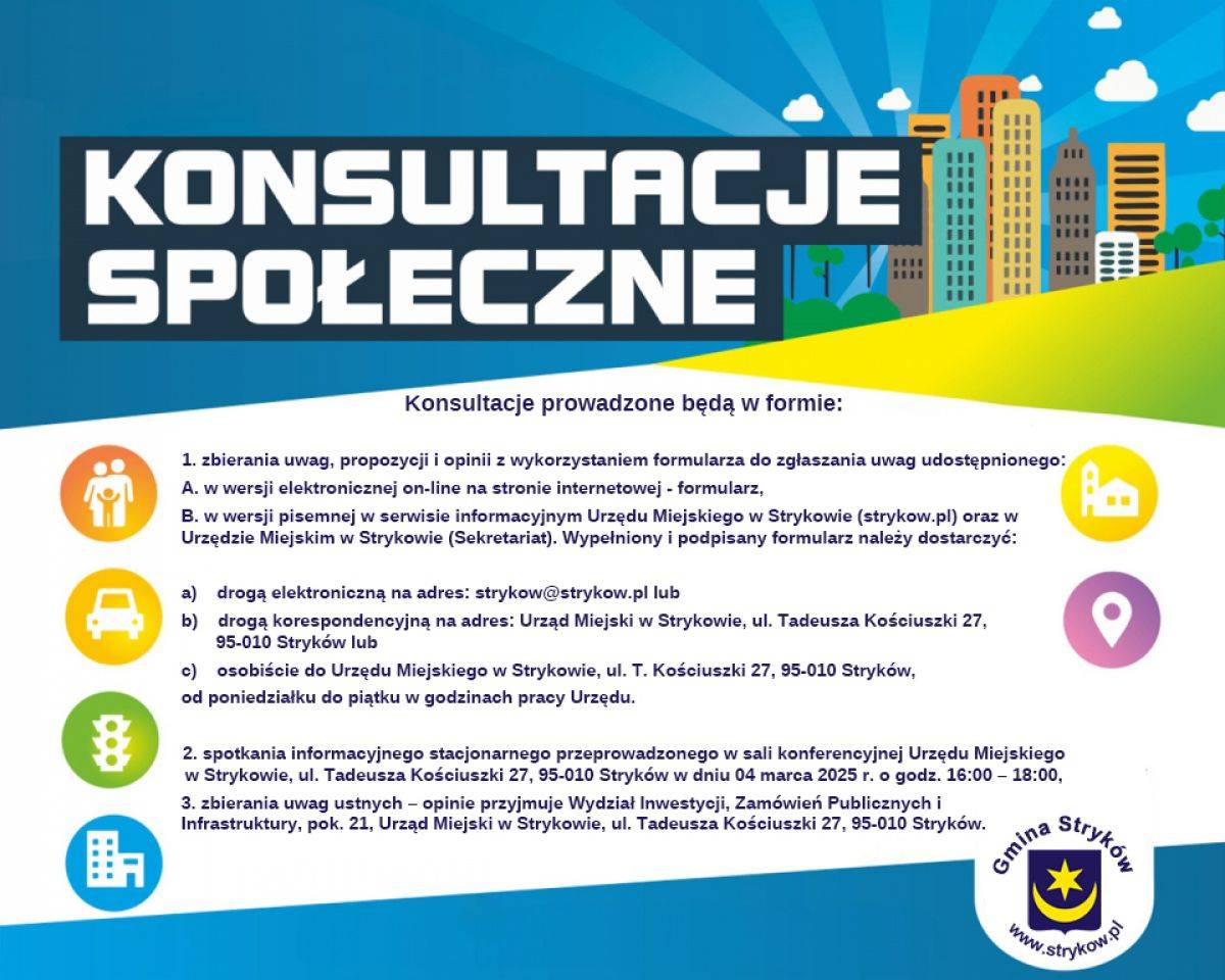 Burmistrz Strykowa ogłasza konsultacje projektu Uchwały w sprawie wyznaczenia obszaru zdegradowanego i obszaru rewitalizacji na terenie Gminy Stryków. Czas trwania konsultacji: od 06 lutego do 13 marca 2025 r.