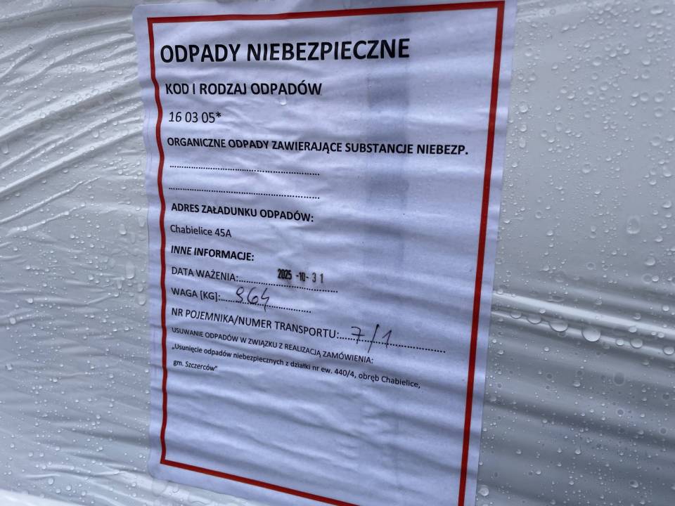W Chabielicach rozpoczął się kolejny, kluczowy etap prac związanych z usuwaniem niebezpiecznych odpadów. W poniedziałek, 3 listopada, ze składowiska odjechało już kilka transportów z mauzerami zawierającymi substancje niebezpieczne – w momencie naszej obecności był to trzeci konwój. To początek intensywnej akcji, która ma doprowadzić do całkowitego oczyszczenia terenu.