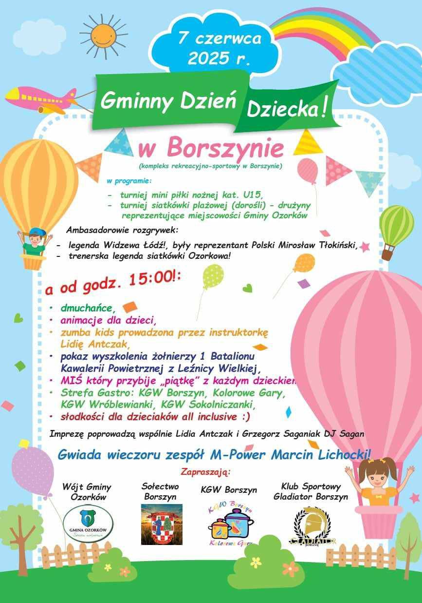 Wójt Gminy Ozorków, Sołectwo Borszyn, KGW Borszyn oraz Klub Sportowy Gladiator Borszyn zapraszają na Gminny Dzień Dziecka, który odbędzie się 7 czerwca w Borszynie.
