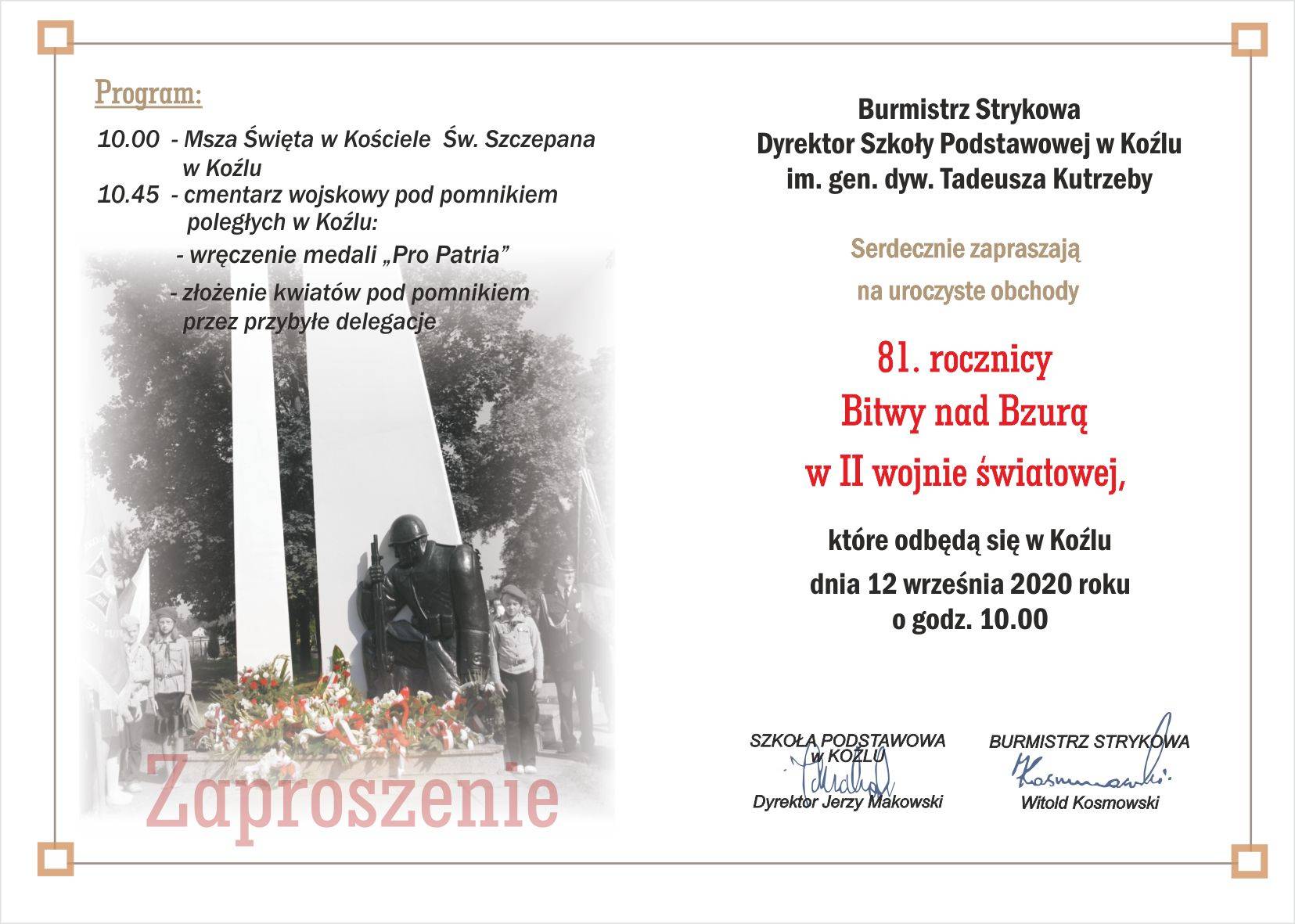 Burmistrz Strykowa i Dyrektor Szkoły Podstawowej w Koźlu im. gen. dyw. Tadeusza Kutrzeby serdecznie zapraszają na uroczyste obchody 81. rocznicy Bitwy nad Bzurą w II wojnie światowej, które odbędą się w sobotę, 12 września o godzinie 10:00 w Koźlu.