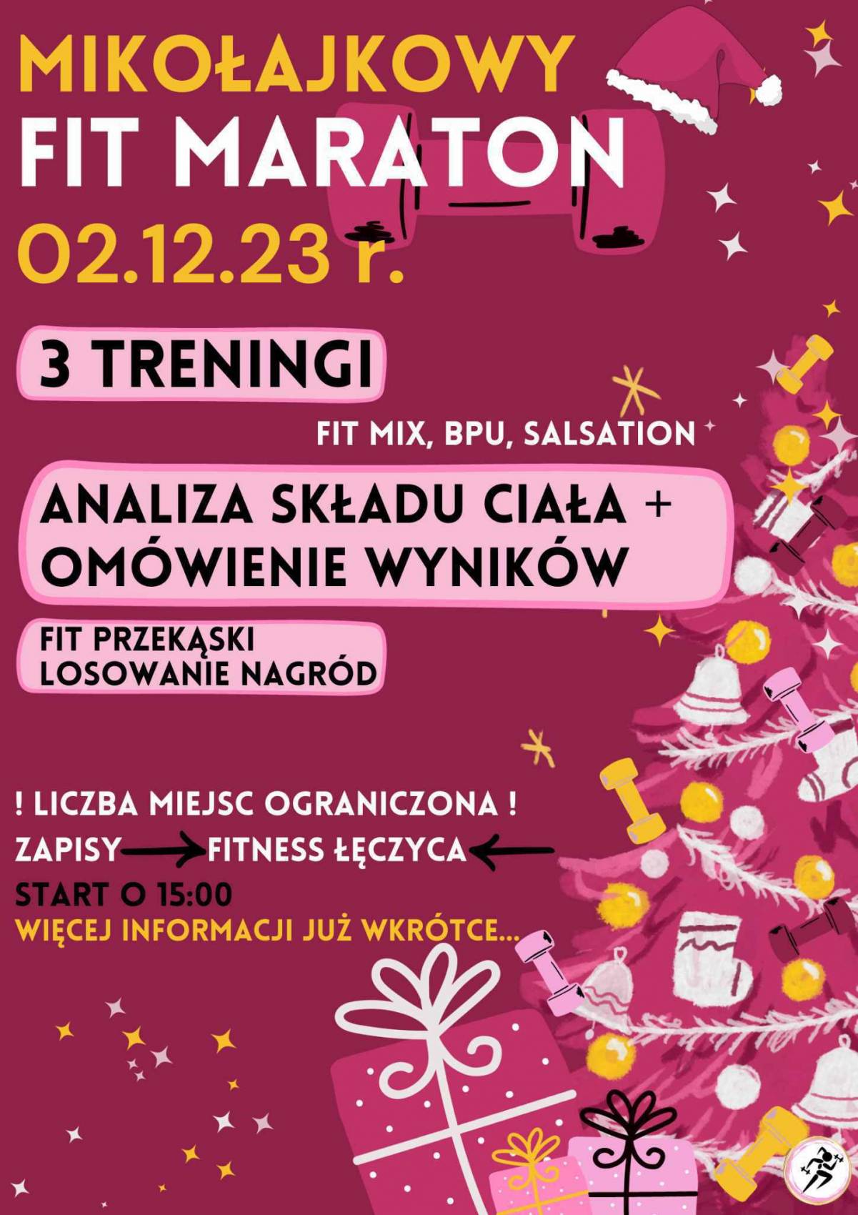 Mikołajkowy Fit Maraton zaplanowany został na sobotę (2 grudnia) i odbędzie się przy ul. Plac Kościuszki 6 (II piętro). W jego ramach odbędą się trzy treningi - Fit Mix, BPU oraz Salsation. Ponadto uczestnicy będą mogli skorzystać z analizy składu ciała, połączonego z omówieniem wyników. Nie zabraknie fit przekąsek czy losowania nagród.