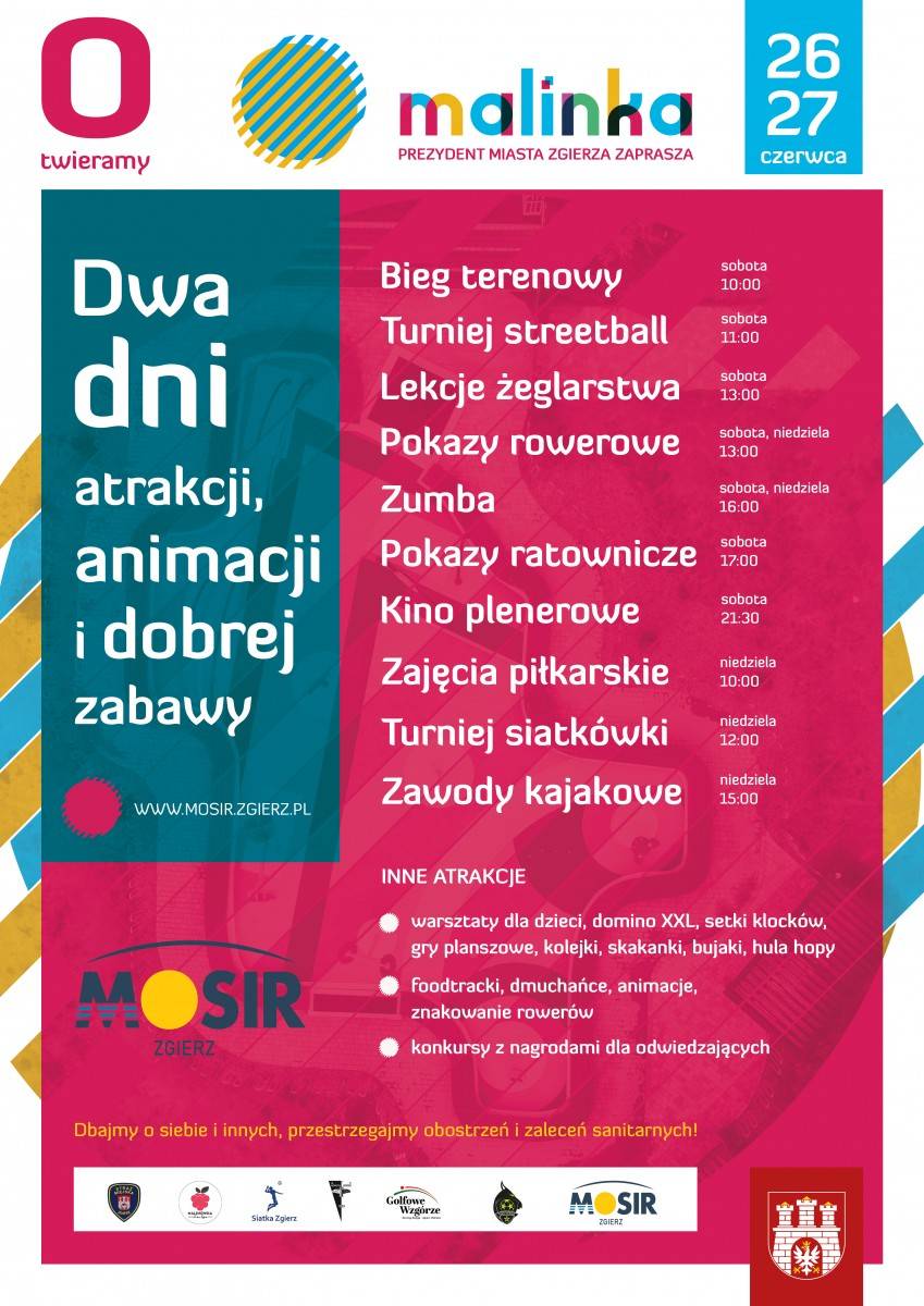 Oczywiście przestrzegać będziemy wszystkich zaleceń i obostrzeń sanitarnych - serdecznie zapraszamy wszystkich zgierzan (i nie tylko) na dwa dni atrakcji, animacji i dobrej zabawy na Malince.