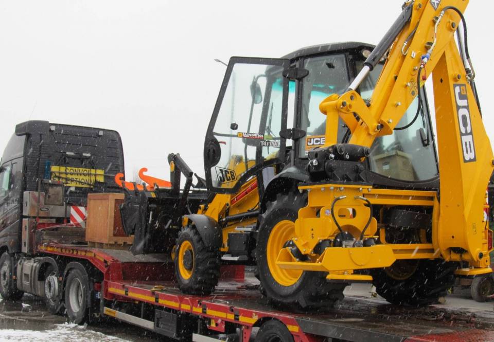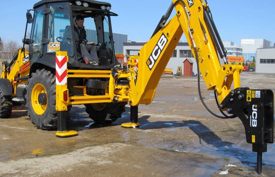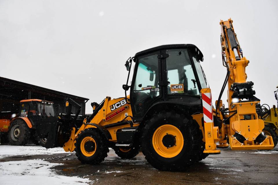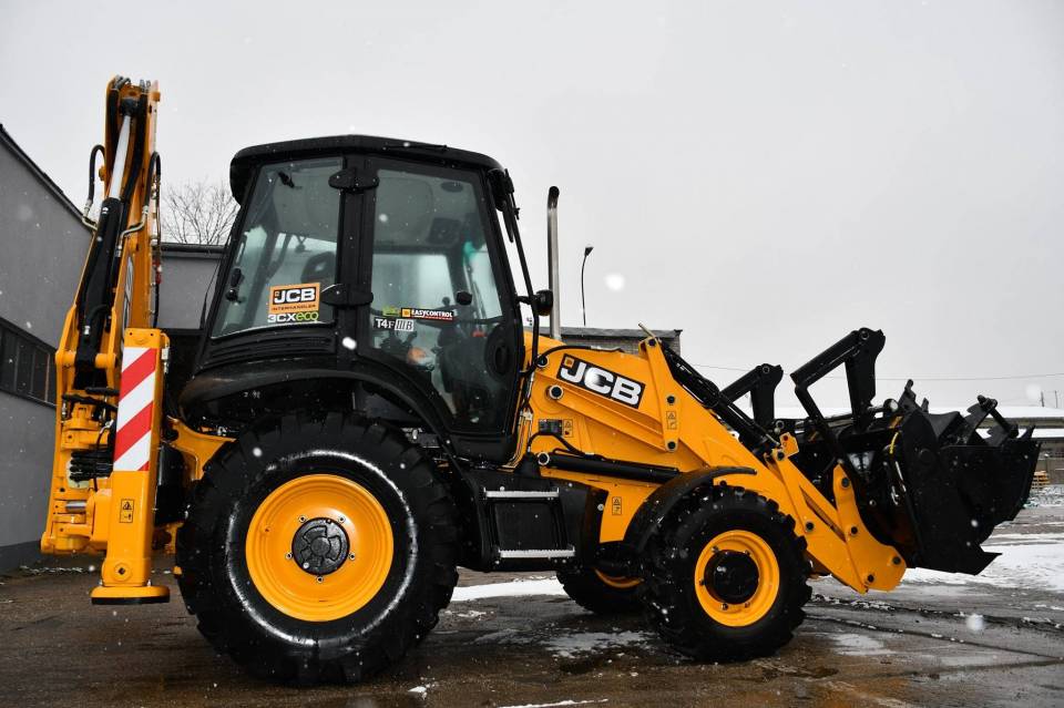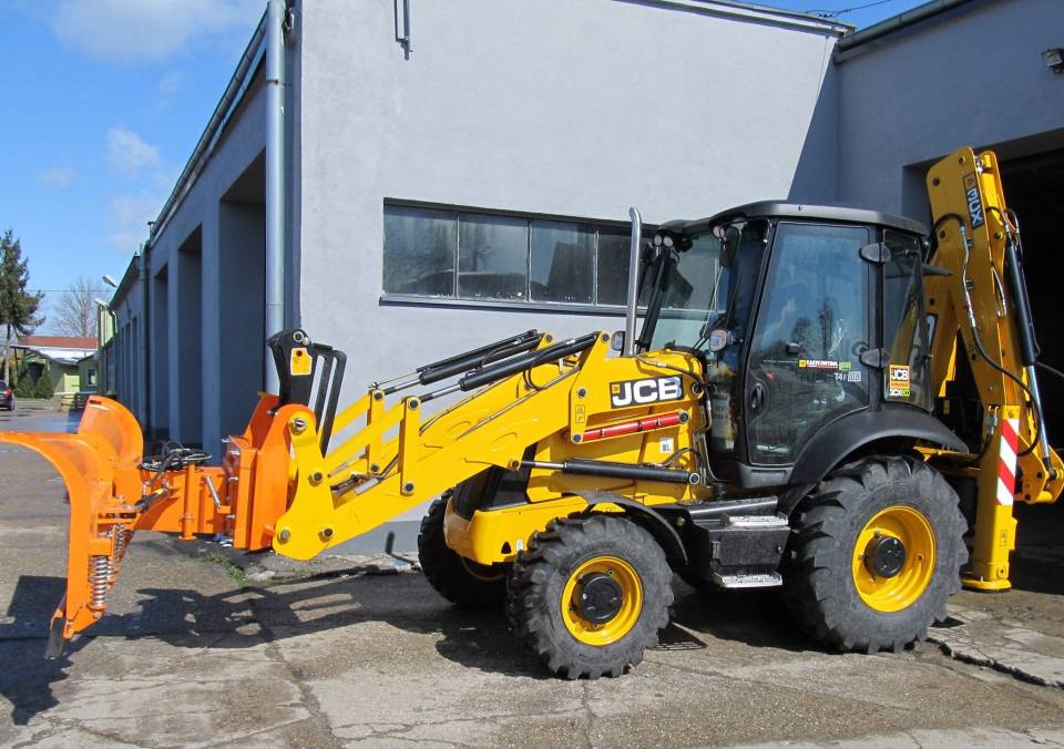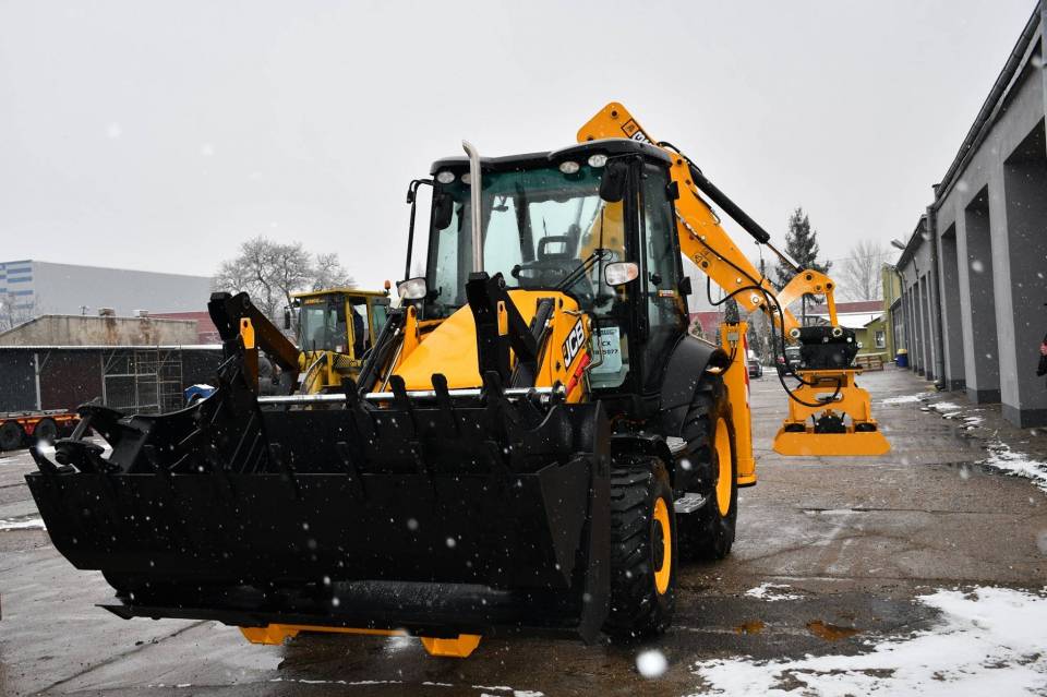 Koparko-ładowarka JCB 3CXECO wyposażona jest m.in. w pług hydrauliczny łamany, młot wyburzeniowy oraz zagęszczarkę.